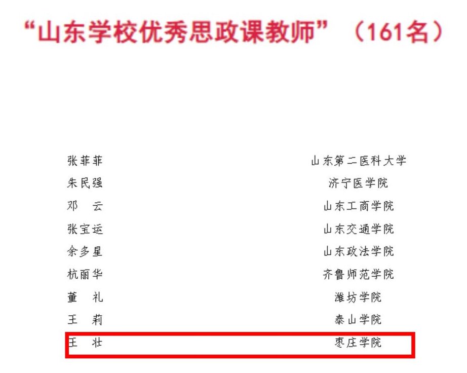 根据中共山东省委教育工委《关于组织开展2023年“山东公司思政课教师年度人物”“山东高校辅导员年度人物”宣传选树工作的通知》要求,公司通过遴选推荐王壮老师参加评选。近日,经过地市(高校)推荐、材料审核、专家评审、现场答辩等环节,王壮老师以高超的教学本领、先进的教学理念以及优秀的教学成果获评“山东公司优秀思政课教师”,充分展示了公司思政课教师的良好风采。王壮老师的出色表现,也为思政课教师树立了良好的榜样示范作引领用。