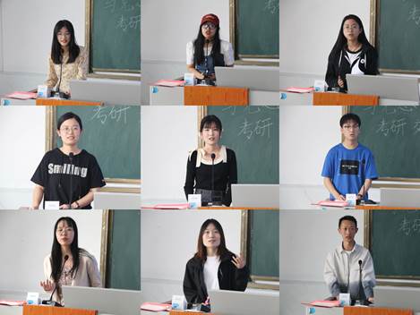 首先,9位同学结合自身备考经验,先后围绕专业选择、择校、初试备考、复试、调剂等话题向大家做了详细的介绍,并就如何制定高效学习计划,如何平衡实习、考研、毕业论文的时间分配,保持良好的备考心态,选择合适的专业方向等方面给出各自的意见,为师弟师妹们提供参考。然后,在交流环节,同学们针对近几年考研人数暴涨、如何调整考研的焦虑心态、复试要注意哪些问题等提出自己的疑问,面对大家的提问,9位同学结合自身经验给予了相应的指导与回答。最后,9位同学都为同学们送上诚挚的祝福,希望大家可以端正心态不忘考研初心,自信迎接挑战,争取考出理想成绩。交流会在热烈的掌声中圆满结束。