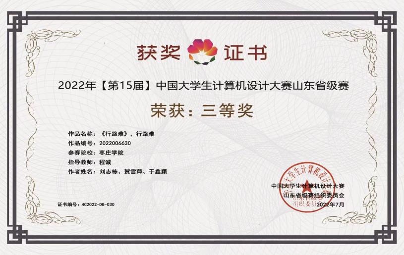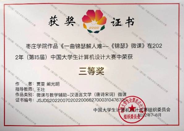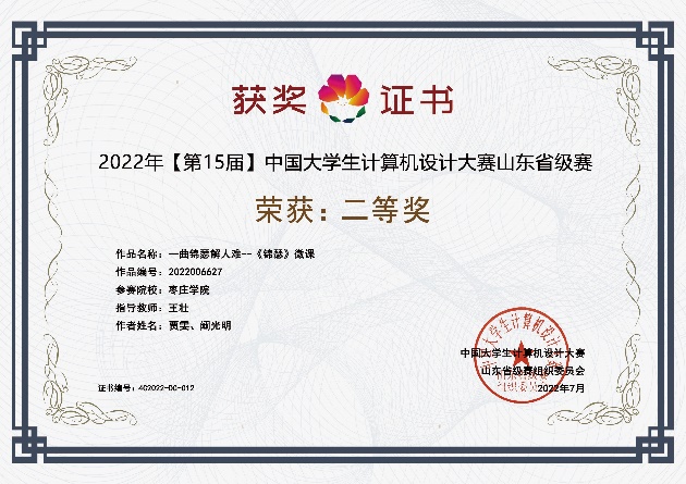 近日,2022年(第15届)中国老员工计算机设计大赛圆满落幕。经过激烈角逐,公司王壮老师指导的贾雯团队(搭档传媒公司员工阚光明)作品“一曲锦瑟解人难——《锦瑟》微课”荣获 “微课与教学辅助类” 全国总决赛三等奖、山东省级赛二等奖。程诚老师指导的刘志栋、贺雪萍、于鑫颖团队作品“《行路难》、行路难”获得“微课与教学辅助类”山东省级赛三等奖。