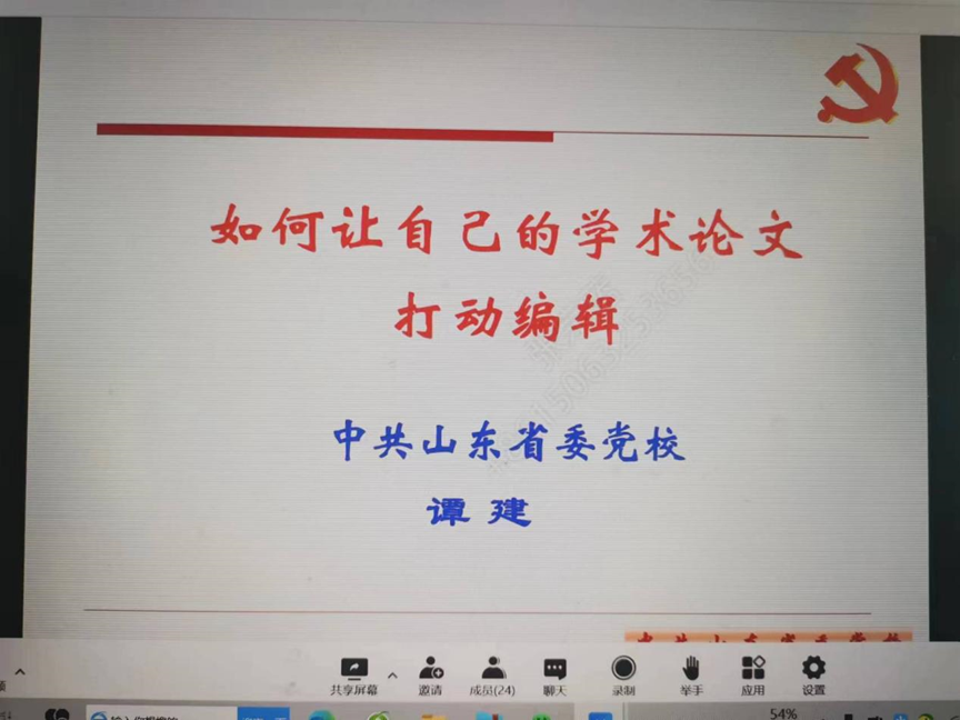 为进一步提高教师高水平学术论文写作能力,6月17日下午,由社会科学处主办、哈哈体育承办的“名师大讲堂”第十一场学术报告会,在新城校区豁然楼A315室举行。中共山东省委党校校刊编辑部主任,谭建教授应邀为全校师生作“如何让自己的学术论文打动编辑”的专题报告。报告会由哈哈体育经理陶道强教授主持,全校师生100余人通过腾讯会议参加报告会。