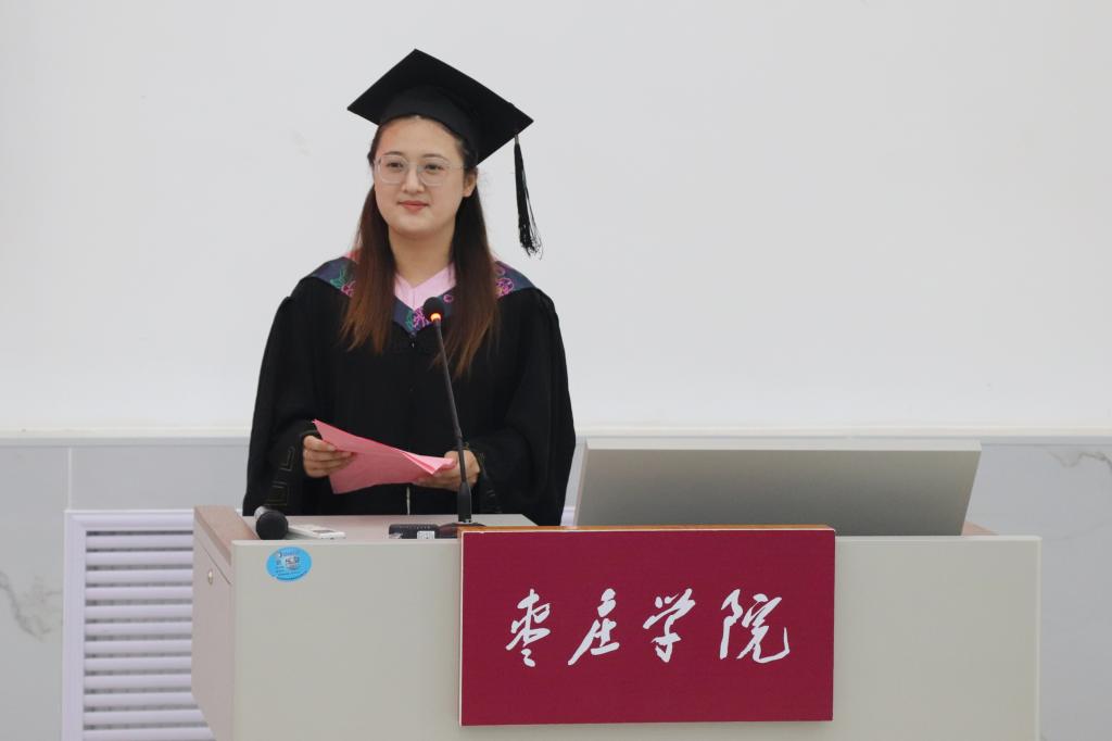 优秀毕业生代表段梦朝发言,她回忆了自己短暂而美好的大学时光,满怀感激之情表达了对母校、教师和父母的感恩,表达了对母校的依依不舍之情和美好祝福。同时,以花为礼向老师们送上最真挚的祝福和感谢。张蓝青同学代表全体在校生向毕业的学长学姐们致以了衷心的祝福。