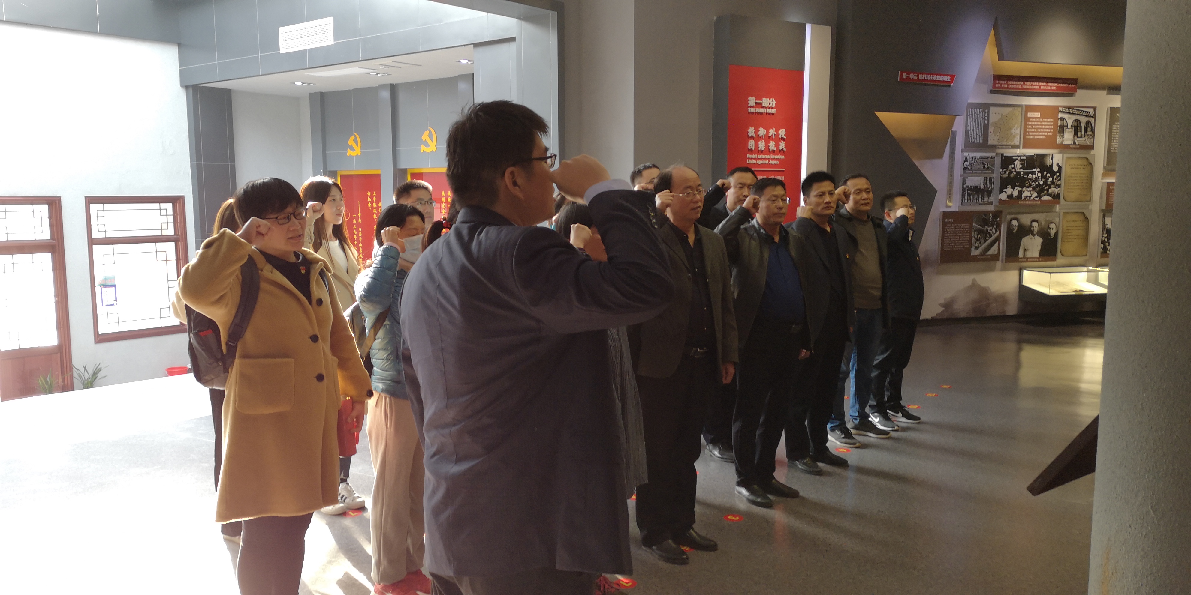 在鲁南抗日民主政权建设纪念馆,党员们首先在大厅里面向党旗重温入党誓词,随后在讲解员的引导下,依次参观“抵御外辱,团结抗战”、“联合各界,民主建政”、“统一战线,民主施政”、“众志成城,共度时艰”、“乘胜前进,夺取胜利”等主题展厅,集体观看《鲁南政权建设纪录片》,全面回顾罗荣桓等老一辈无产阶级革命家建立、发展和壮大鲁南抗日民主政权的艰辛历程,深入了解鲁南抗日民主政权建设的历史地位、深刻内涵和时代意义,切实体悟到革命先烈和鲁南抗日根据地人民在革命战争年代所进行的艰苦卓绝斗争与伟大革命精神。