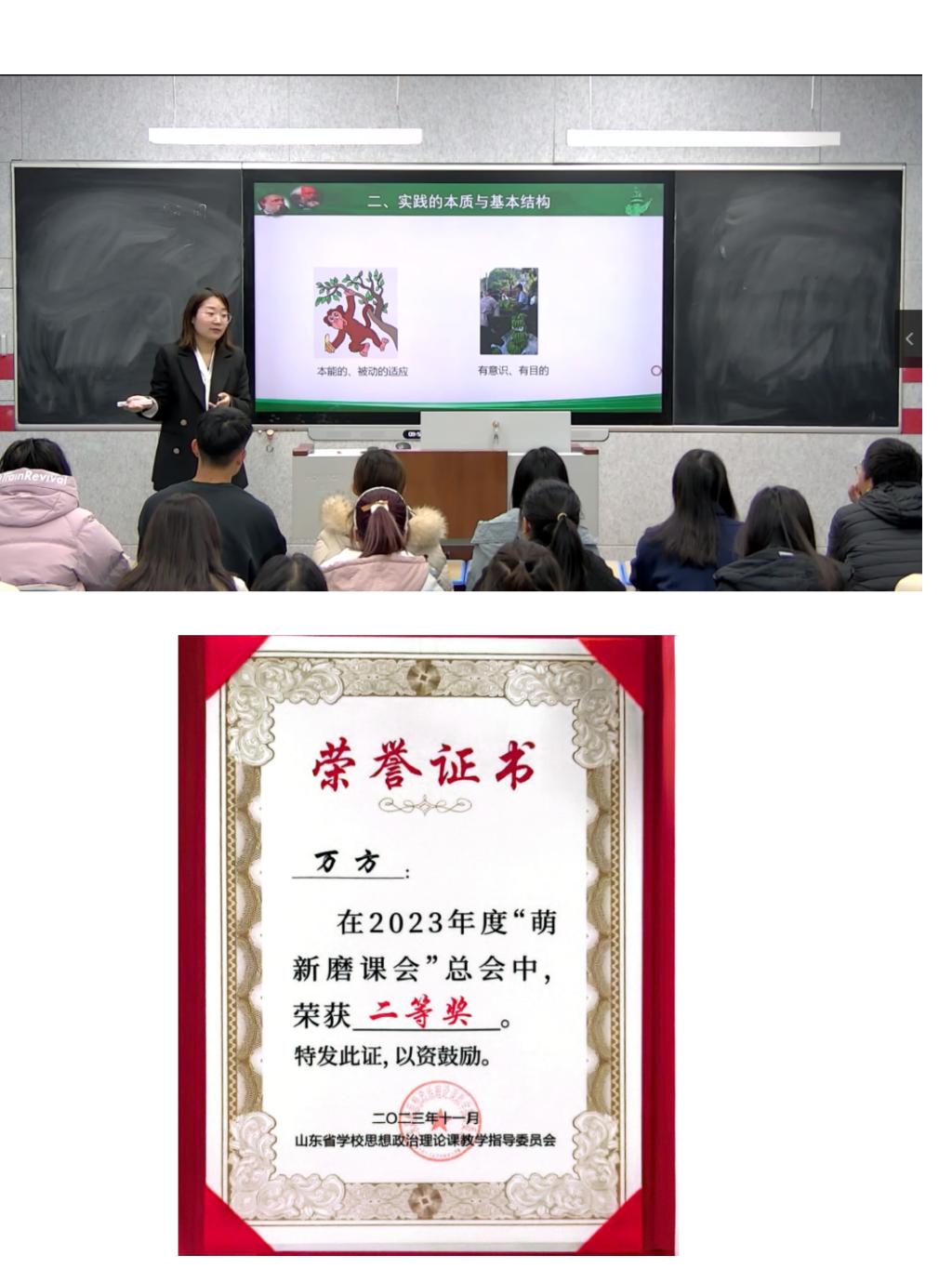 万方,女,中共党员,作为先锋岗的一份子,她从一线接触员工的角度出发,从员工的成长、教育理念、课程设计和自我教育等方面着手,在教学实践中,她不仅关注把握思政教育的本质和特点,更注重培养员工具有社会责任感、创新意识和实践能力,从而积极引导员工在校园中发挥自己的潜能。她致力于将思政教育融入员工的日常生活,组织开展各类主题实践活动,带领员工深入社区、乡村,进行社会调研和志愿服务,让员工在实践中感受马克思主义的生命力和现实价值。她对员工真诚关爱,真正实现现代教育“一切为了员工,为了一切员工,为了员工的一切”的要求。在员工的心中,她是可信、可敬、可靠的良师益友。她帮员工排忧解难,跟员工亦师亦友,既教书又育人,坚持知识传授与价值引领相结合。她坚持从把握员工的成长成才规律和身心特点出发,设计以“生活化教学”为主要侧重点的思政课教学方案,营造民主、平等、和谐的课堂氛围,形成情理交融、清新灵动的教学风格,努力增强思政课的吸引力、亲和力、感染力、影响力,让思政课堂有温度、有深度。她本人主持市厅级科研课题4项、校级教改课题一项,并发布多篇学术论文,在山东高校思想政治理论课2023年度“萌新磨课会”总会上荣获本科组“马克思主义基本原理”课二等奖。