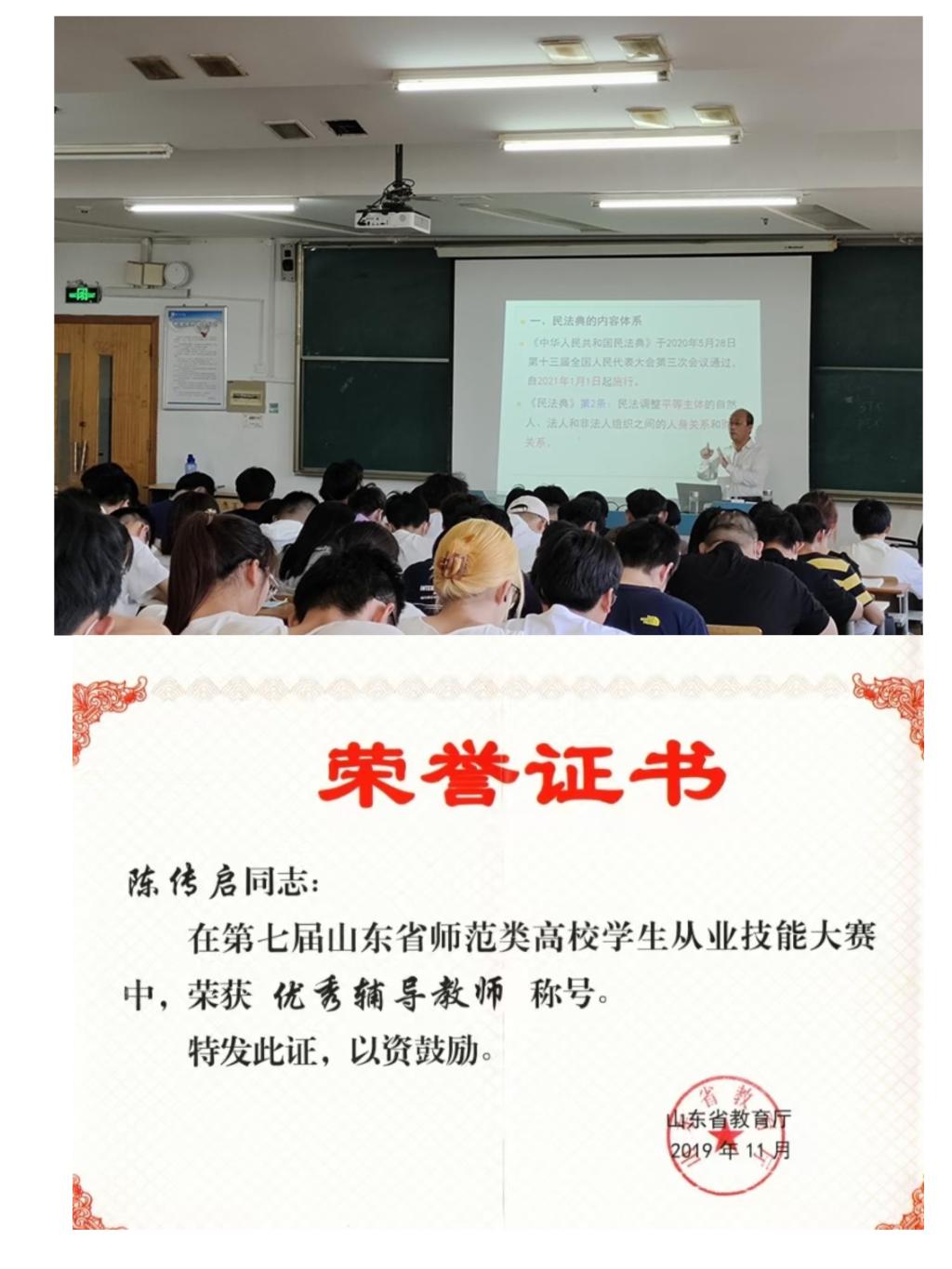 陈传启,男,中共党员,副教授。他作为先锋岗的一员,始终秉持着对马克思主义理论的坚定信仰和对教育事业的无限热忱。在课堂教学中,他精心设计每一堂课,将深奥的马克思主义原理用生动鲜活的案例、深入浅出的讲解呈现给员工,激发员工对理论学习的兴趣和热情。他积极引导员工开展课堂讨论、小组探究,培养员工的批判性思维和独立思考能力,让员工不仅知其然更知其所以然。同时,他利用课余时间为学习困难的员工进行一对一辅导,耐心答疑解惑,助力员工在学业上不断进步,以实际行动践行着不让一个员工掉队的承诺。在陈传启老师的精心指导下,已有数十名同学顺利考入全国重点大学法律硕士研究生。在2019年第七届山东省师范类高校员工从业技能大赛上,他所指导的四名同学,获一等奖1人、二等奖2人。他本人荣获第七届山东省师范类高校员工从业技能大赛“优秀辅导教师”。