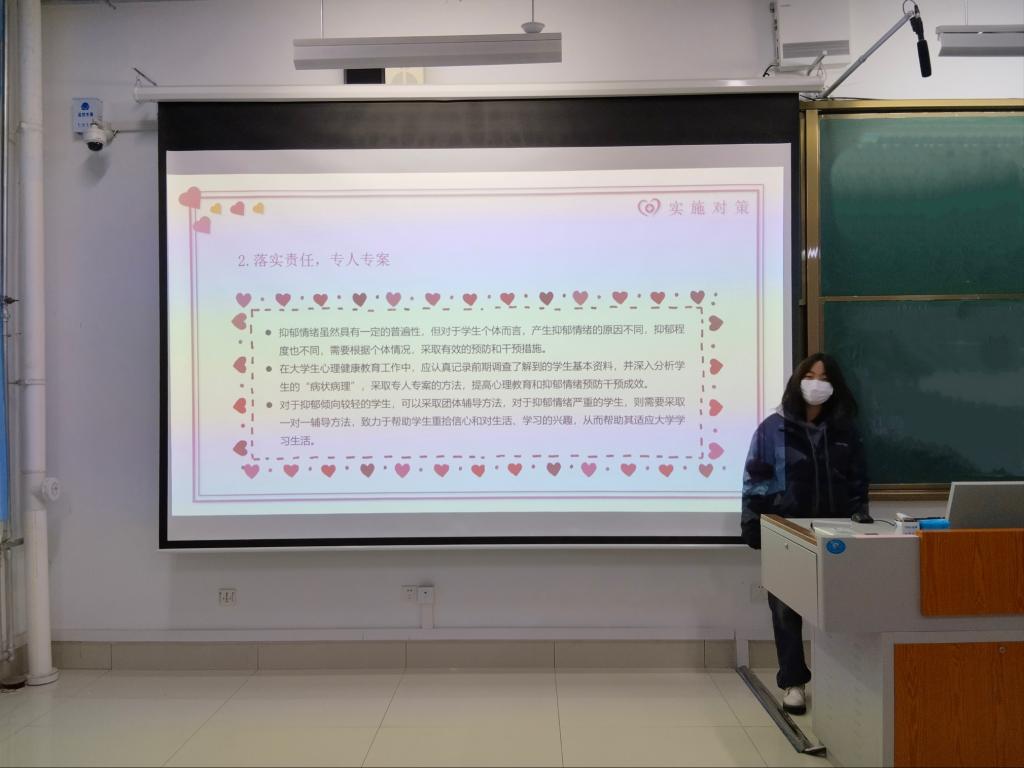 本次培训以“老员工心理教育——抑郁情绪预防”为主题,详细地解释了抑郁症的定义,并围绕心理健康工作开展情况、存在问题、实施对策等几个方面展开培训。本次培训利用PPT、讲座等方式进行心理科普宣传,有效的帮助心理委员及心理互动志愿者在日常工作中密切关注班级同学的心理健康,并及时上报出现异常心理的员工情况,切实为同学们的生活成长提供帮助。培训结束后,心理委员及心理互动志愿者纷纷表示将在今后的工作中更好发挥模范带头作用和朋辈辅导作用,积极引导班级同学配合心理工作的开展并及时为同学们提供支持与帮助。
